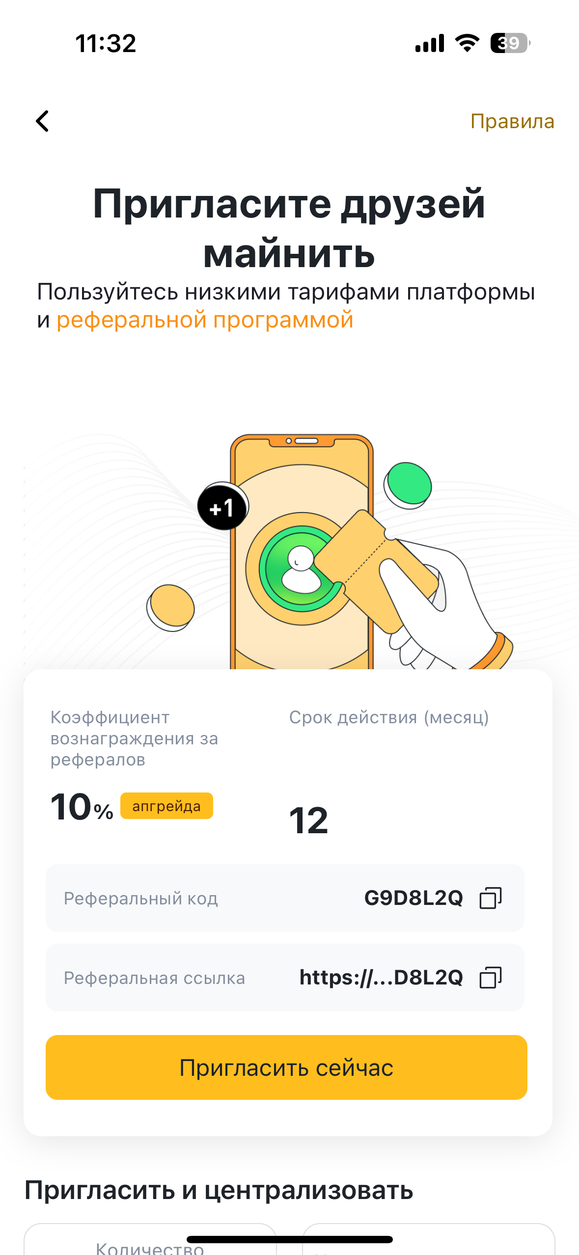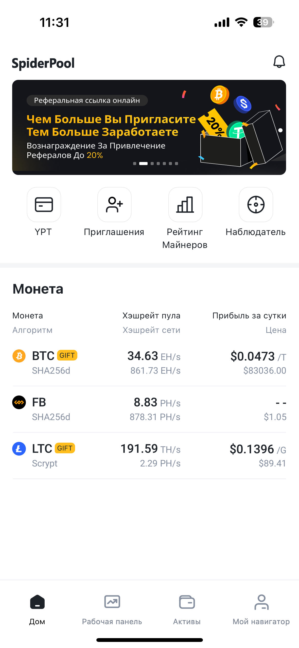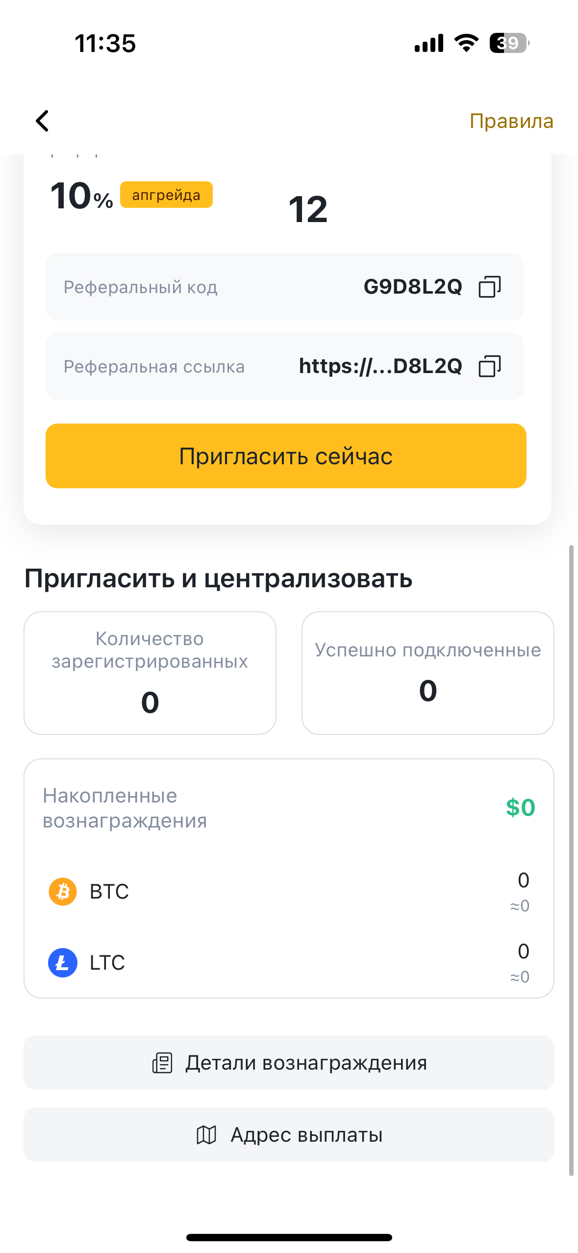 Вы можете получать вознаграждения за привлечение новых пользователей, в зависимости от активности привлеченных майнеров.