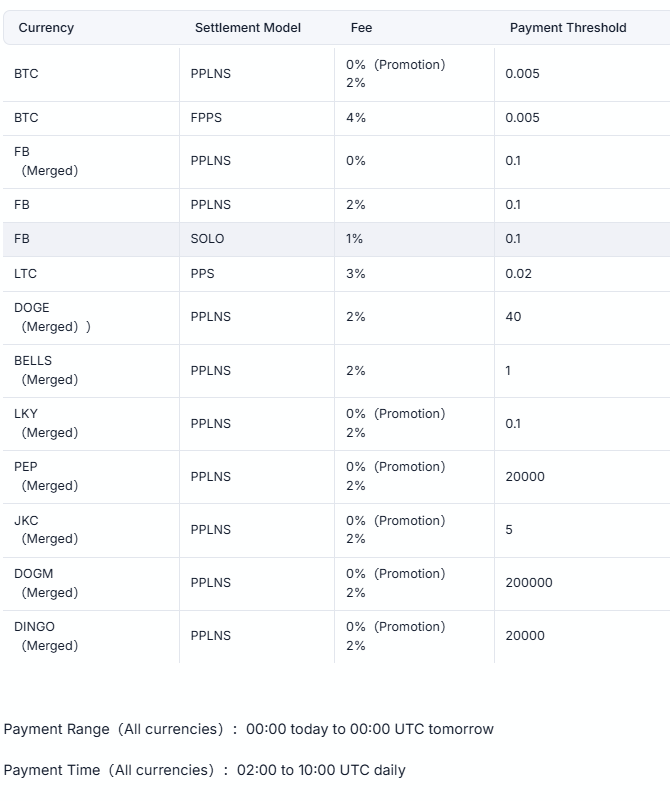 Пул предлагает несколько моделей выплат: PPLNS, PPS, FPPS и SOLO.